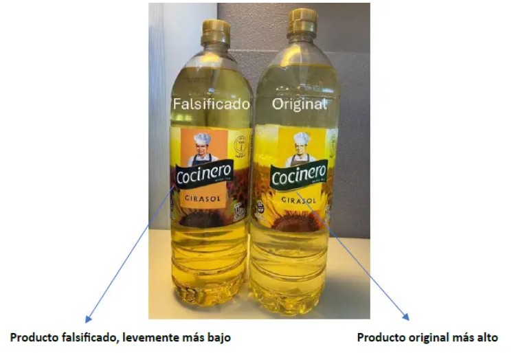 - El envase del producto original informa el número de molde de soplado, las siglas “PET†y el sÃmbolo de reciclado, mientras que el falsificado no contiene esta información.