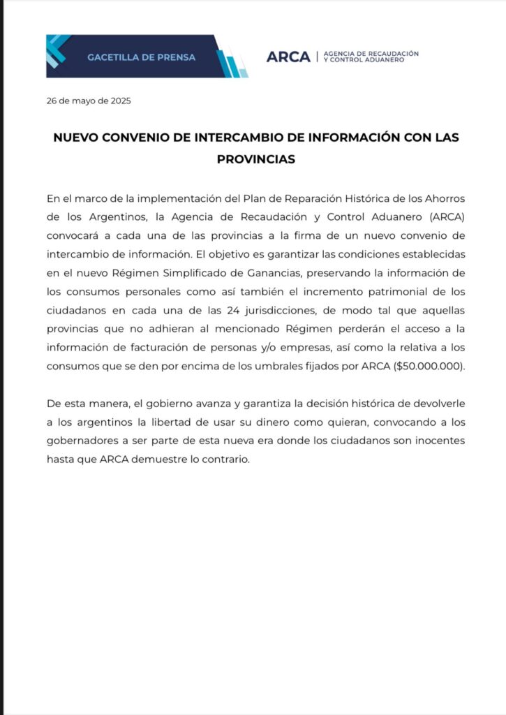 Al detallar los alcances de la nueva normativa, el titular del ARCA sostuvo que el paquete de medidas busca “dejar atrás mecanismos de control fiscal que invadían la privacidad de las personas” y propiciar el ingreso al sistema formal.