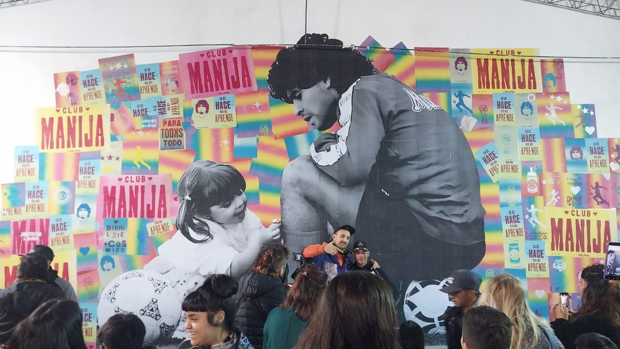 El mural no pasó desapercibido. Pintado con furia mansa y colores que gritan, retrata a Diego con Dalma todavía pequeña y que originalmente es una foto familiar. Lo presentaron en la reinauguración del salón comunitario, y la emoción fue colectiva, con vecinos, funcionarios y artistas abrazando la escena como si se tratara de un gol agónico en tiempo suplementario.