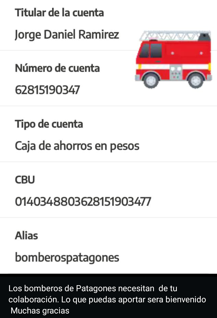 La Asociación de Bomberos voluntarios de Patagones le pide a la población de nuestras ciudades el apoyo económico a través de una cuenta a nombre del tesorero de la institución para poder salir de este difícil momento “que la gente pueda depositar lo que quiera, pueda o lo que sea. Para nosotros todo es beneficioso porque entre todos podemos ayudar". Fuente Patagones a Diario