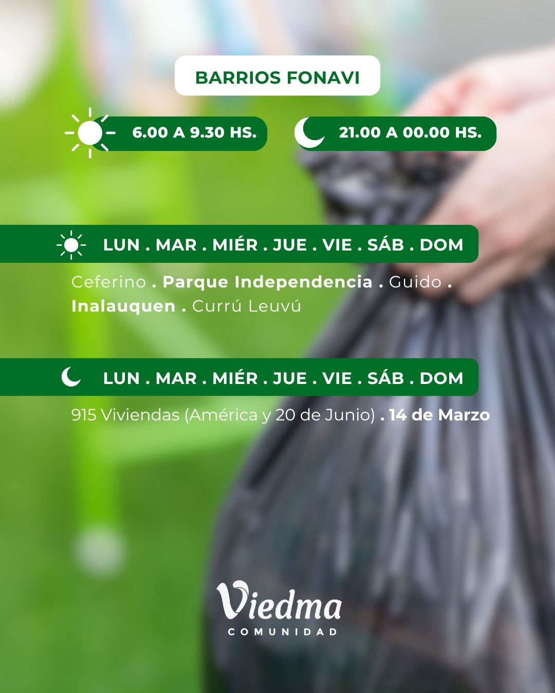 En los denominados barrios FONAVI, el servicio de recolección se realizará todos los días; en el turno de la mañana se incluye a Ceferino, Parque Independencia, Guido, Inalauquen y Currú Leuvú, mientras que en el turno de la noche se cubren las 915 Viviendas (América y 20 de Junio) y 14 de Marzo.