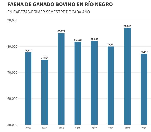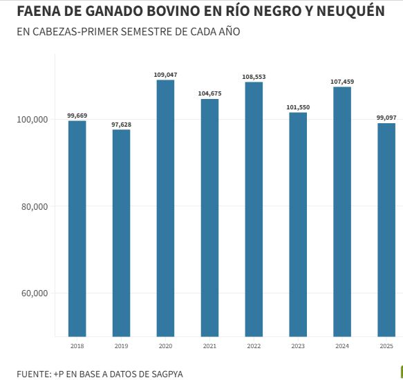 La faena de hacienda en el norte de la Patagonia muestra una clara tendencia a la baja. Según el reporte de la Secretaría de Agricultura, Ganadería y Pesca de la Nación (SAGPyA), en el primer semestre del año se faenaron apenas 99.000 cabezas, un 8% menos que en 2024 y un 7% por debajo del promedio de los últimos cinco años.