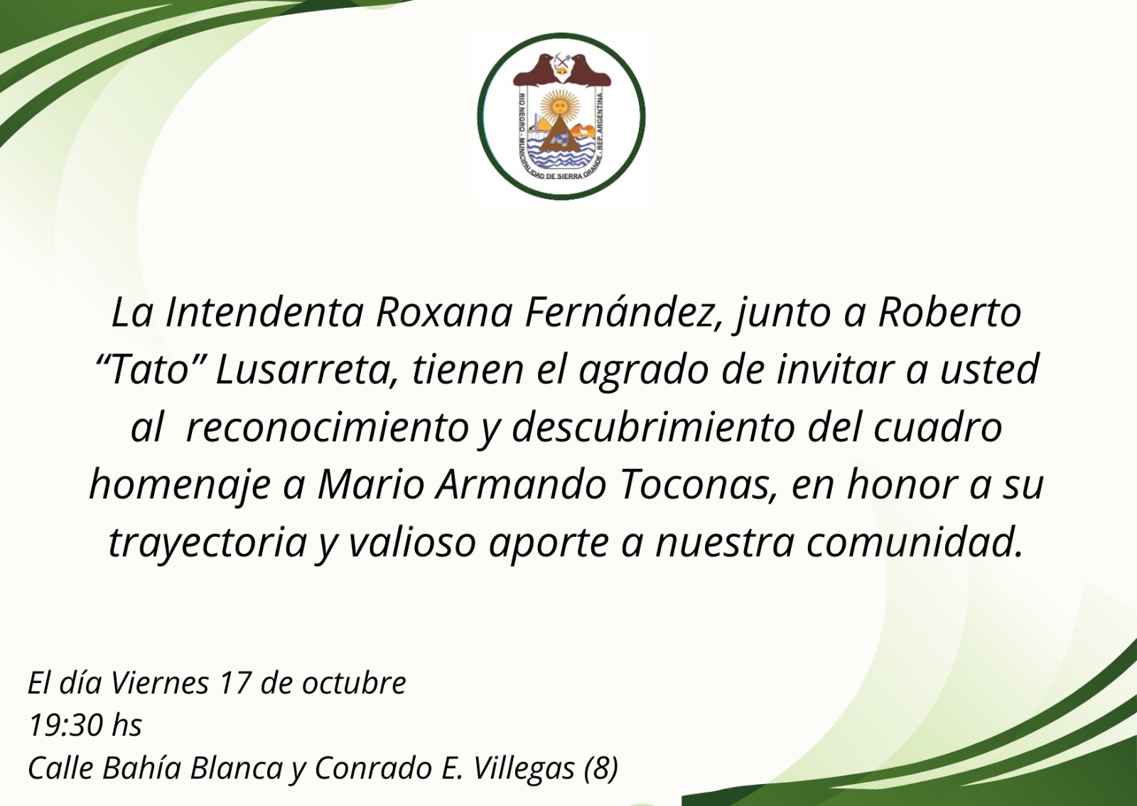 La Intendenta Roxana Fernández y Roberto "Tato" Lusarreta invitan a la comunidad al acto de reconocimiento y descubrimiento de un cuadro en homenaje a Mario Armando Toconas, en honor a su trayectoria y valioso aporte. El evento se realizará el viernes 17 de octubre a las 19:30 hs.